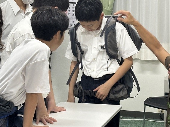 当日は、8名の中学生と4名の保護者の方々が、実際に登山用具を身に着けるなどしながら真剣に座学に取り組みました。